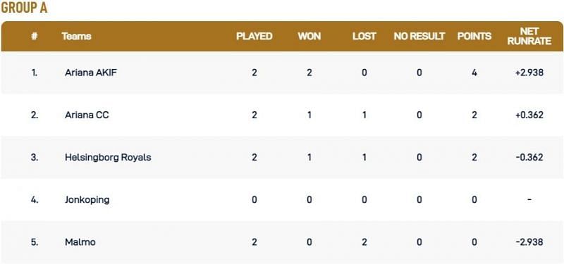 They are followed by Ariana CC and Helsingborg Royals, who have two points each to their credit. The former are placed higher in the Group A standings due to their better net run rate.