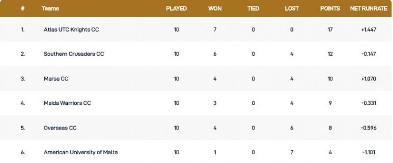 Atlas UTC Knights CC have finished atop the Malta T10 League 2020 points table with 17 points in their kitty. They won seven of their ten league stage matches, with the other three encounters being abandoned.