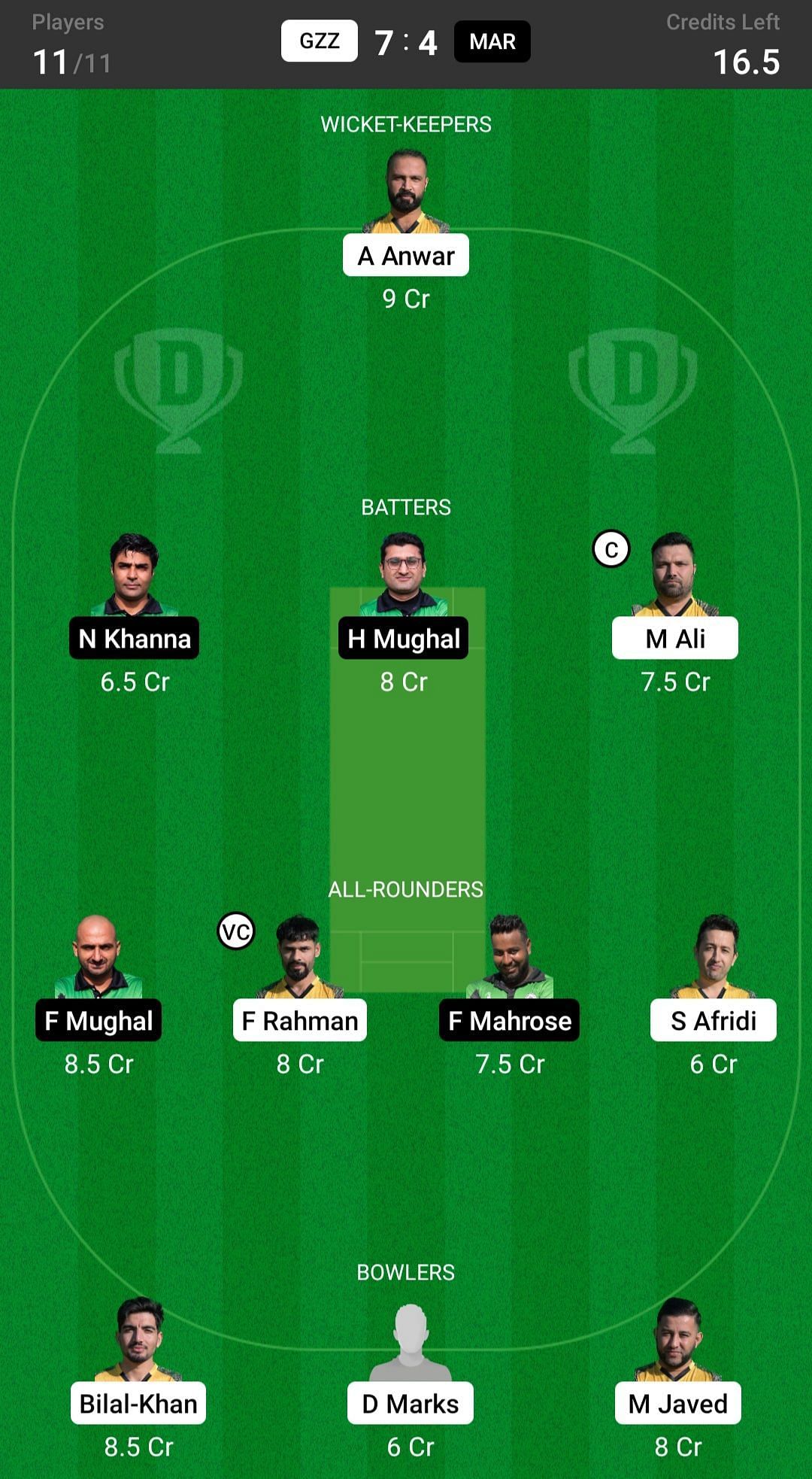 N Khanna and M Ali are the two best batter picks for the Dream11 team. H Mughal played exceptionally well in the last series and will hope to carry the momentum in this tournament. He is also a good pick for today's Dream11 fantasy team.