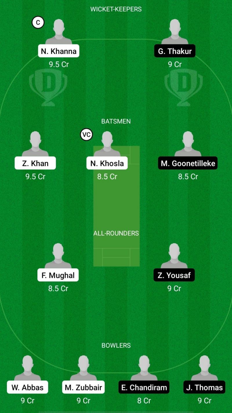 Fantasy Suggestion #1: Niraj Khanna, Gopal Thakur, Zeeshan Khan, Nowell Khosla, Michael Goonetilleke, Fanyan Mughal, Zeshan Yousaf, Waseem Abbas, Muhammad Zubbair, Eardley Chandiram, Jojo Thomas.