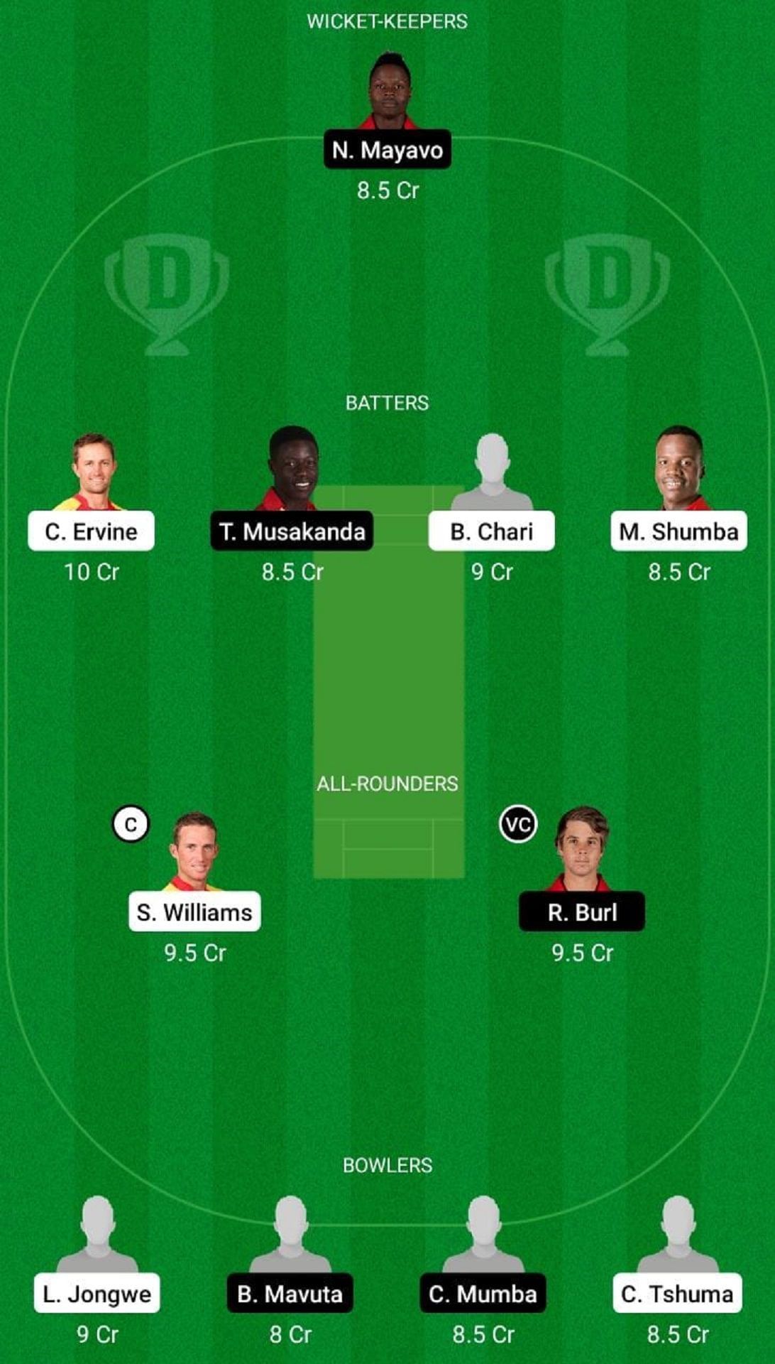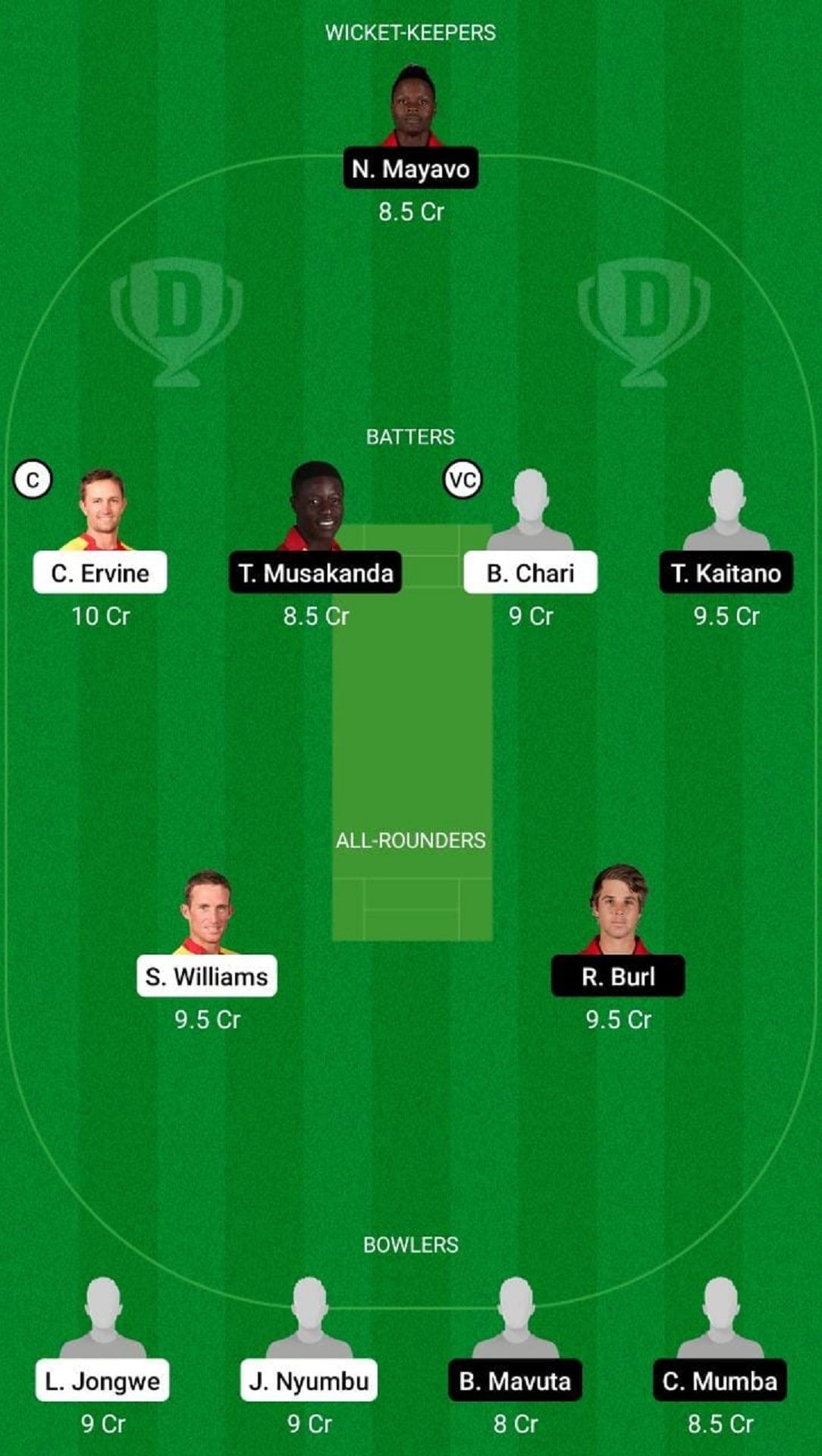 Fantasy Suggestion #2: N Mayavo, B Chari, C Ervine, T Kaitano, T Musakanda, R Burl, S Williams, B Mavuta, C Mumba, J Nyumbu, L Jognwe
