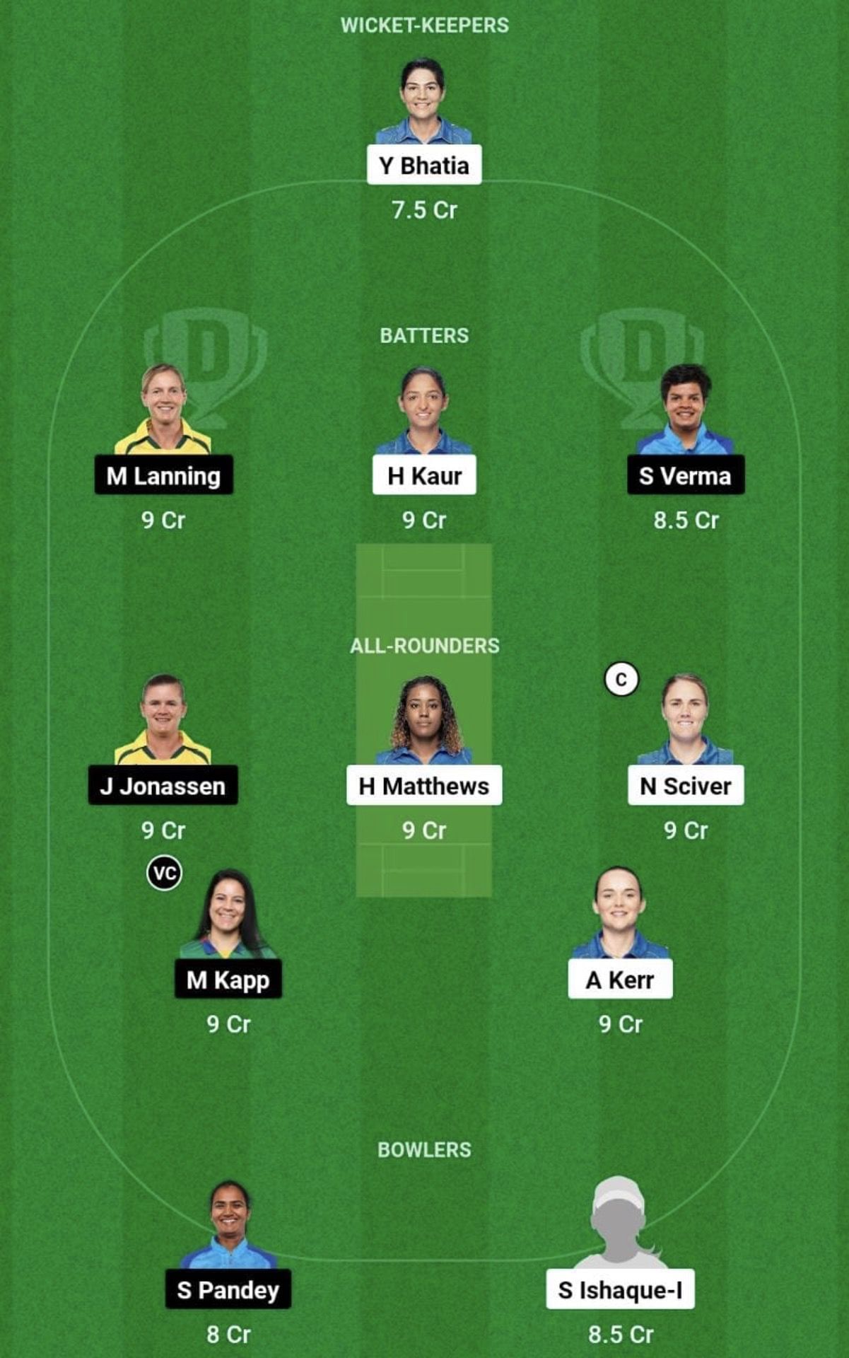 Meg Lanning is the second-leading runscorer in the WPL so far with 239 runs in six matches. She has an average of 38.00 and has scored her runs at a fair clip too. With Lanning in decent form coming into this game, she is a must-have in your MI-W vs DEL-W Dream11 prediction team.