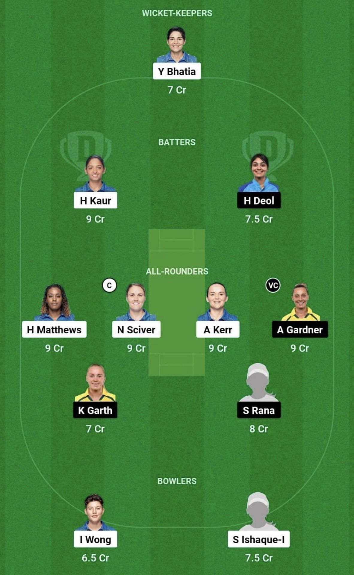 Yastika Bhatia (wk), Hayley Matthews, Natalie Sciver, Harmanpreet Kaur (c), Amelia Kerr, Amanjot Kaur, Pooja Vastrakar/Dhara Gujjar, Issy Wong, Saika Ishaque, Jintimani Kalita and Humaira Kazi.