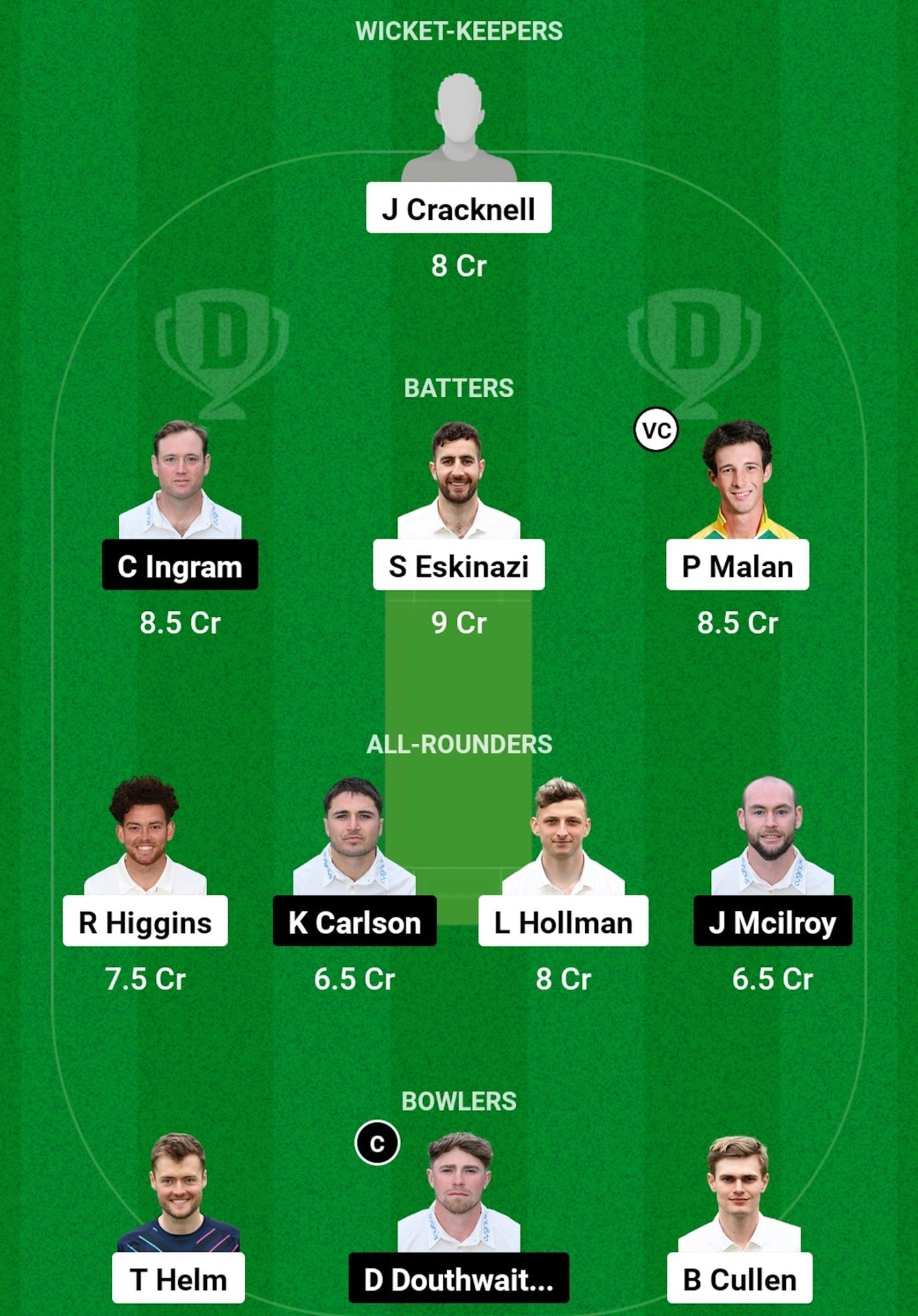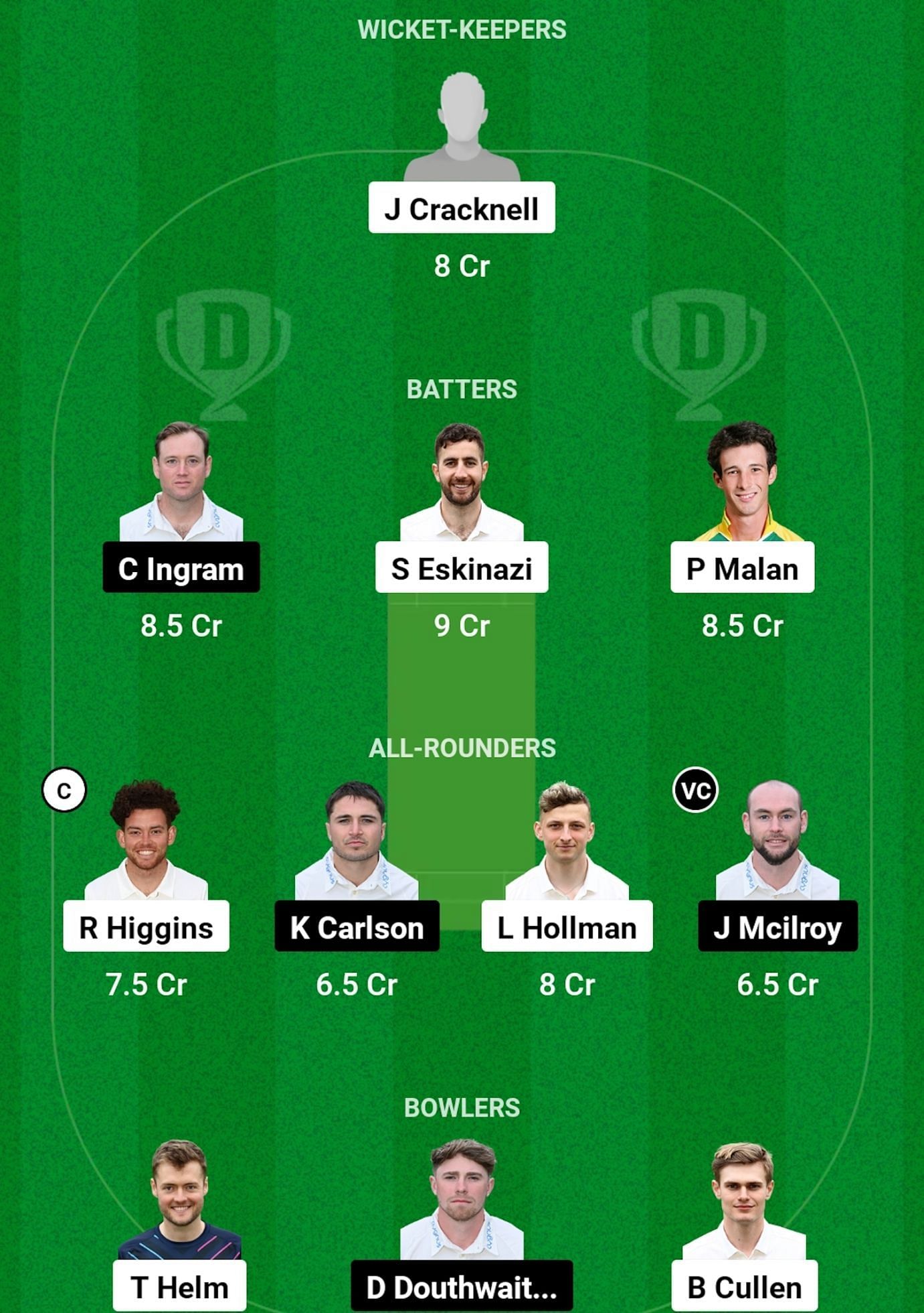 All-rounders: Ryan Higgins, K Carlson, L Hollman, J Mcliroy