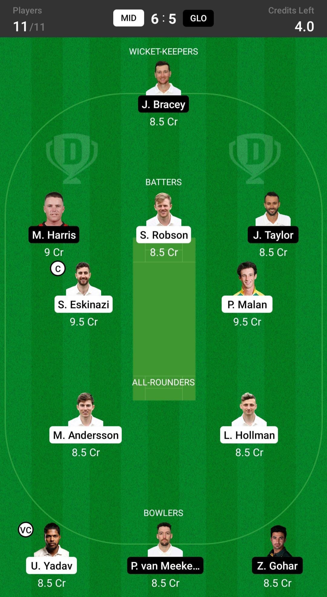 MID vs GLO match captain and vice-captain choices