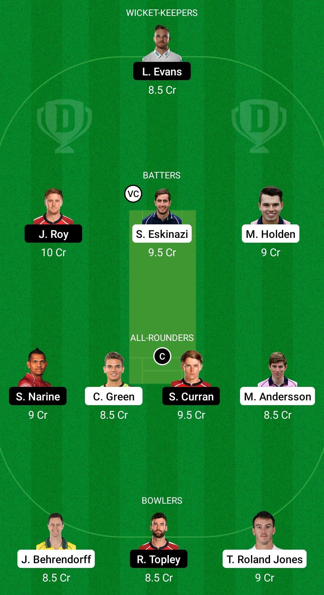 Fantasy Suggestion #1: Laurie Evans, Jason Roy, Stephen Eskinazi, Max Holden, Sunil Narine, Chris Green, Sam Curran, Martin Andersson, Jason Behrendorff, Reece Topley, Toby Roland-Jones