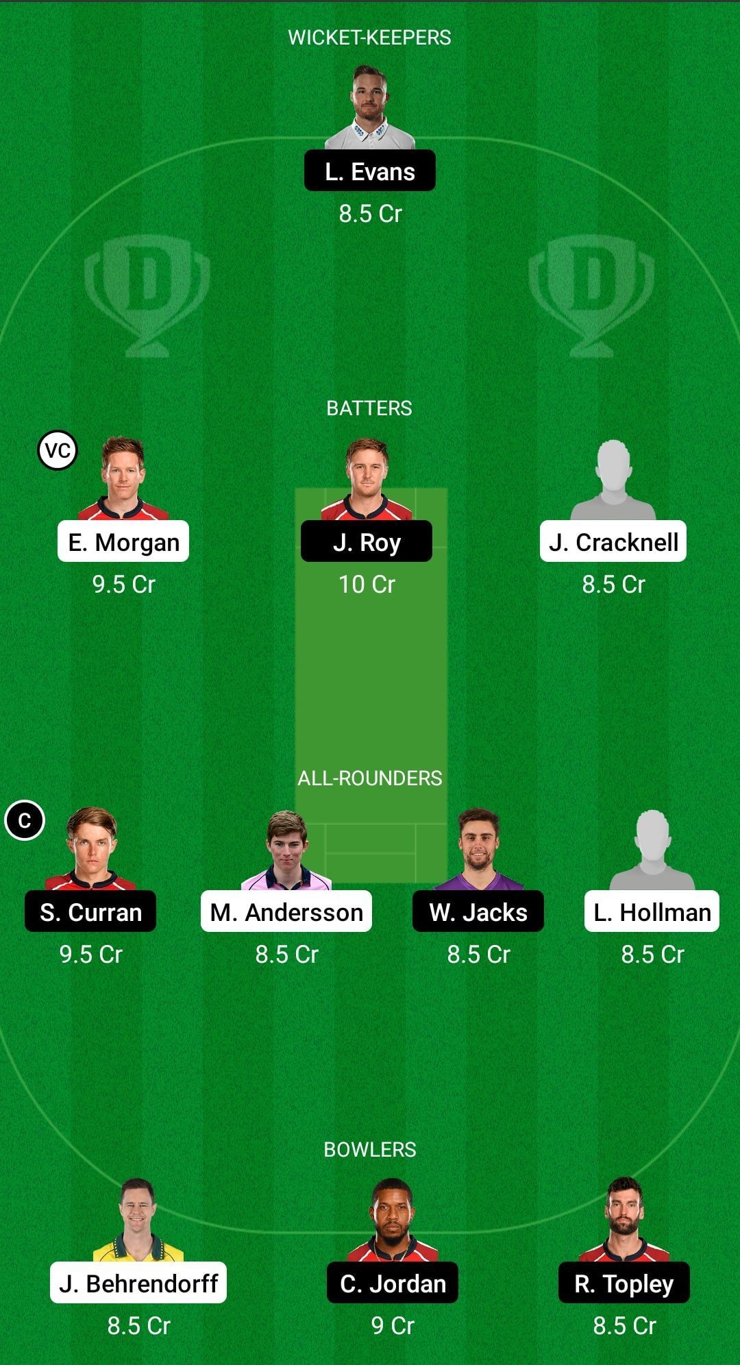 Fantasy Suggestion #2: Laurie Evans, Eoin Morgan, Jason Roy, Joe Cracknell, Sam Curran, Martin Andersson, Will Jacks, Luke Hollman, Jason Behrendorff, Chris Jordan, Reece Topley