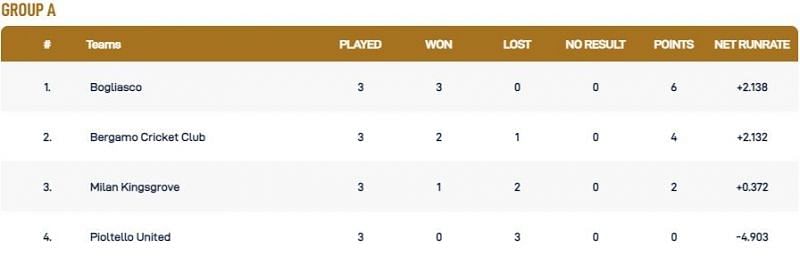 Milan United and Milan Cricket Club occupy the last two spots in Group B. They are yet to register a point after suffering defeats in their opening encounter of the tournament.