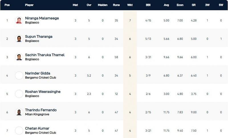Supun Tharanga and Sachin Tharuka Thamel, also from Bogliasco, have both accounted for six opposition batsmen. The former is placed higher on the wicket-taking charts due to his better economy rate.