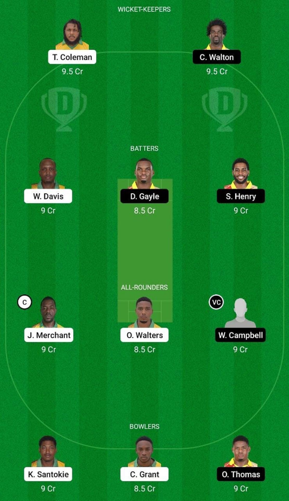 Fantasy Suggestion #2: T. Coleman, D. Gayle, S. Henry, W. Davis, W. Campbell, J. Merchant, O. Walters, O. Thomas, K. Santokie, C. Grant, A. Fraser