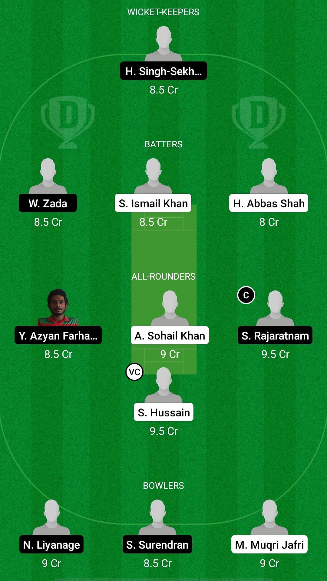Fantasy Suggestion #1: Harinderjit Singh, Wahib Zada, Said Ismail Khan, Hosnain Abbas Shah, Yoosuf Azyan Farhath, Amir Sohail Khan, Shivnarin Rajaratnam, Shahnisha Hussain, Neville Liyanage, Sharveen Surendran, Muhammad Muqri Jafri