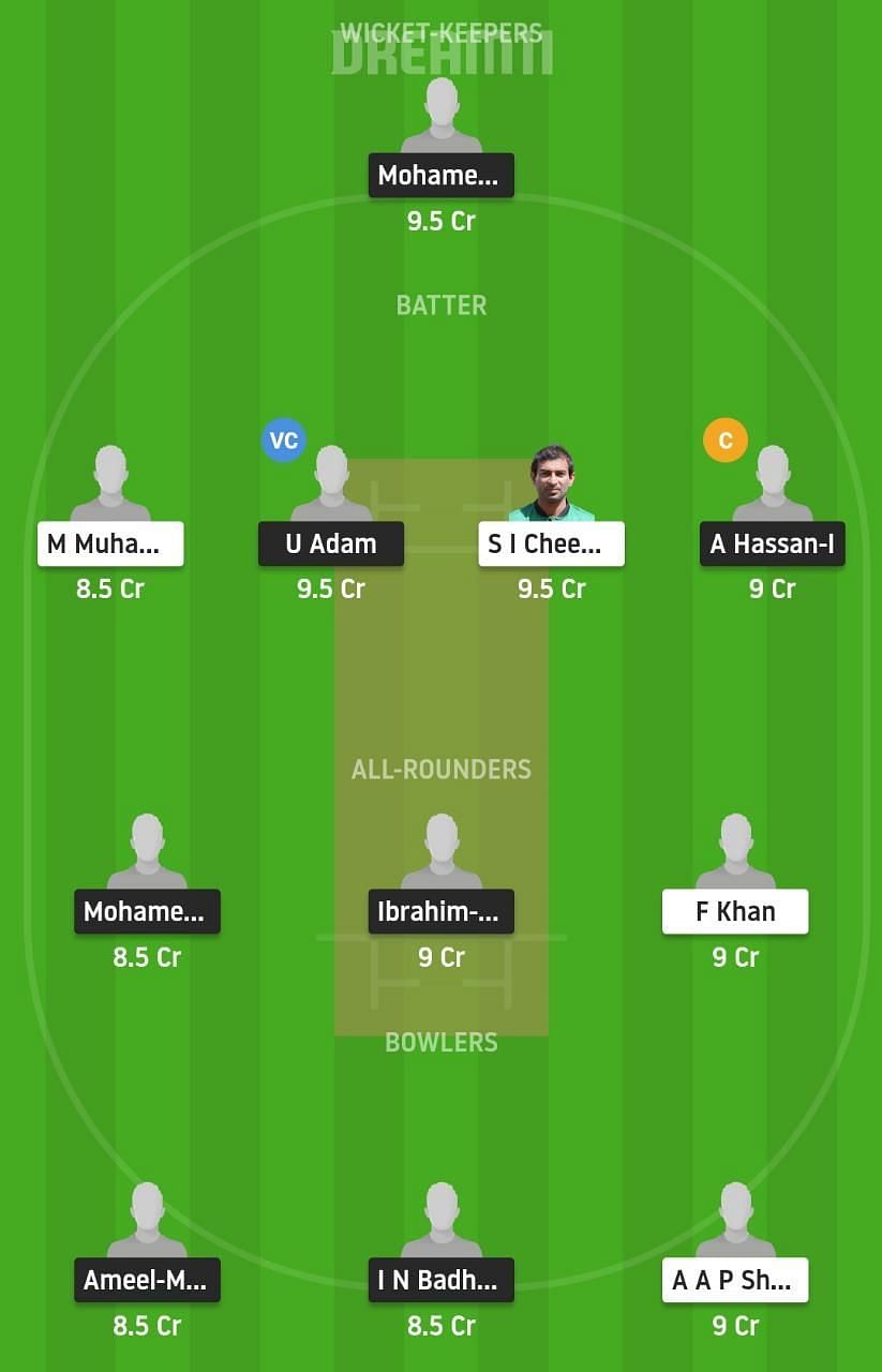 Umar Adam, Ahmed Hassan, Mohamed Rishwan, Hassan Rasheed, Ameel Mauroof, Mohamed Azzam (Wk), Mohamed Mahfooz(C), Ibrahim Hassan, Leem Shafeeg, Ibrahim Rizan, Ibrahim Nashath.