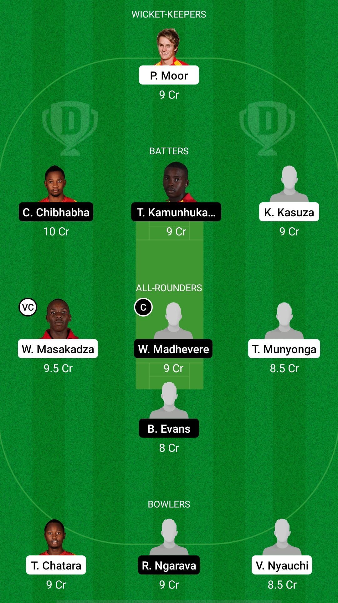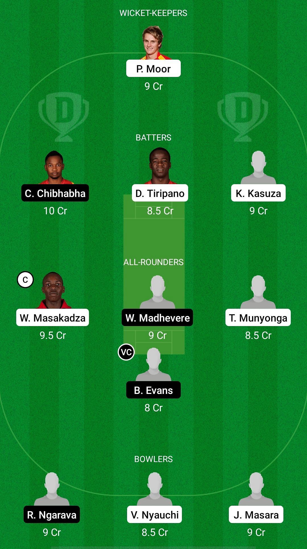 Fantasy Suggestion #1: Peter Moor, Chamu Chibhabha, Tinashe Kamunhukamwe, Kevin Kasuza, Wellington Masakadza, Brad Evans, Tony Munyonga, Wesley Madhevere, Tendai Chatara, Richard Ngarava, Victor Nyauchi.