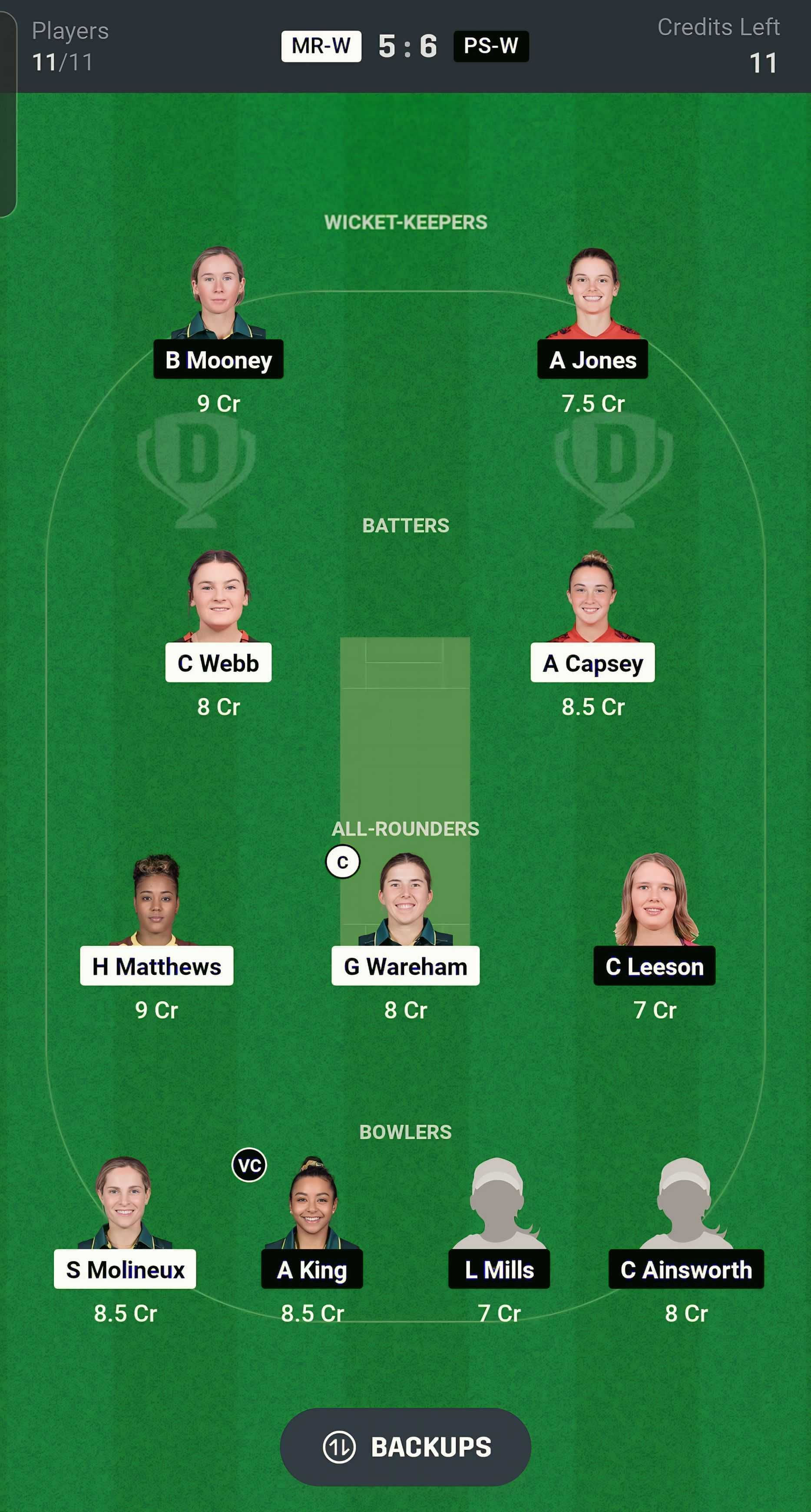 As the pitch is expected to be well balanced, it is advisable to make a team keeping that in mind. Making all-rounders or bowlers the captain or vice-captain is the best way to gain maximum points and win grand leagues in today's match. Women matches generally favor bowlers, so try adding more all-rounders and bowlers in the team.