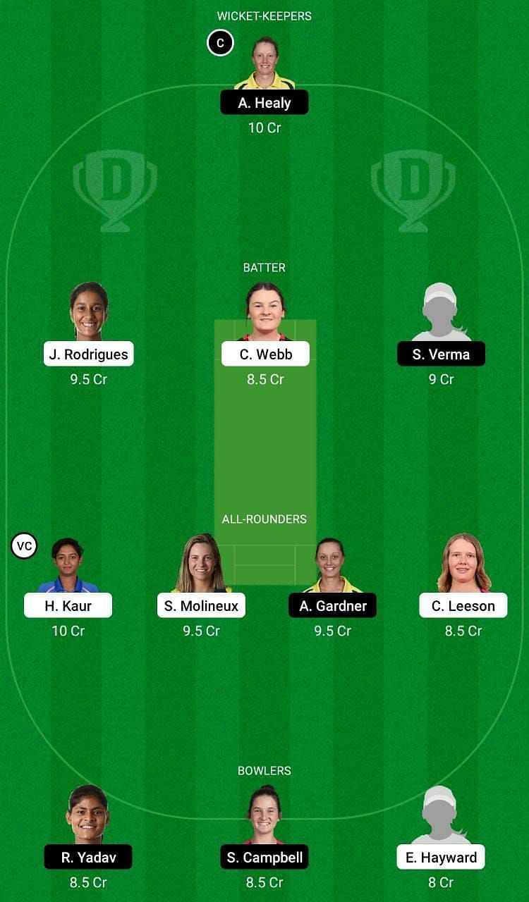 Fantasy Suggestion #1: Alyssa Healy, Jemimah Rodrigues, Courtney Webb, Shafali Verma, Harmanpreet Kaur, Sophie Molineux, Ashleigh Gardner, Carly Leeson, Radha Yadav, Stella Campbell and Ella Hayward