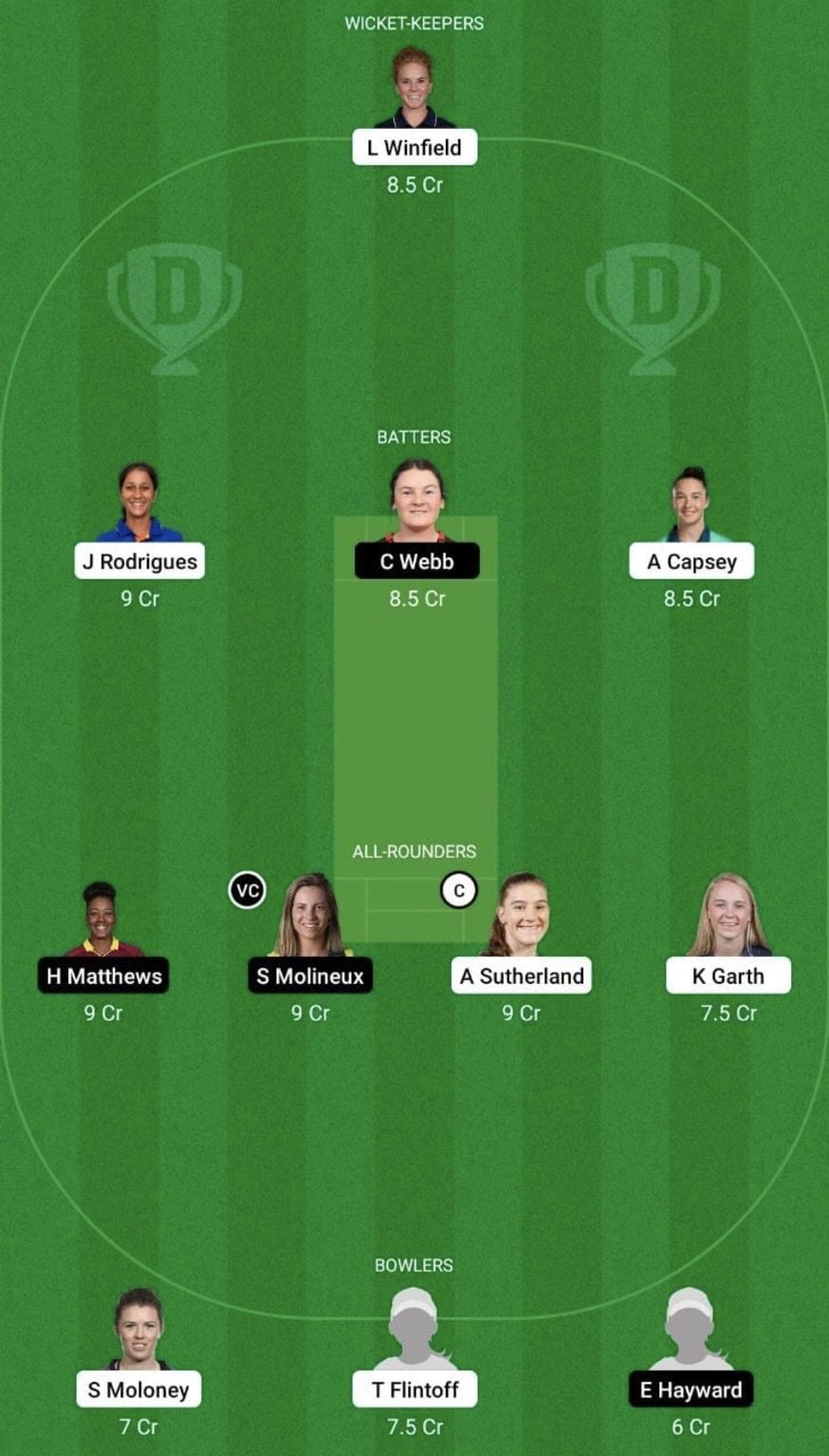 All-rounders: Hayley Matthews, Sophie Molineux (vc), Annabel Sutherland (c), Kim Garth