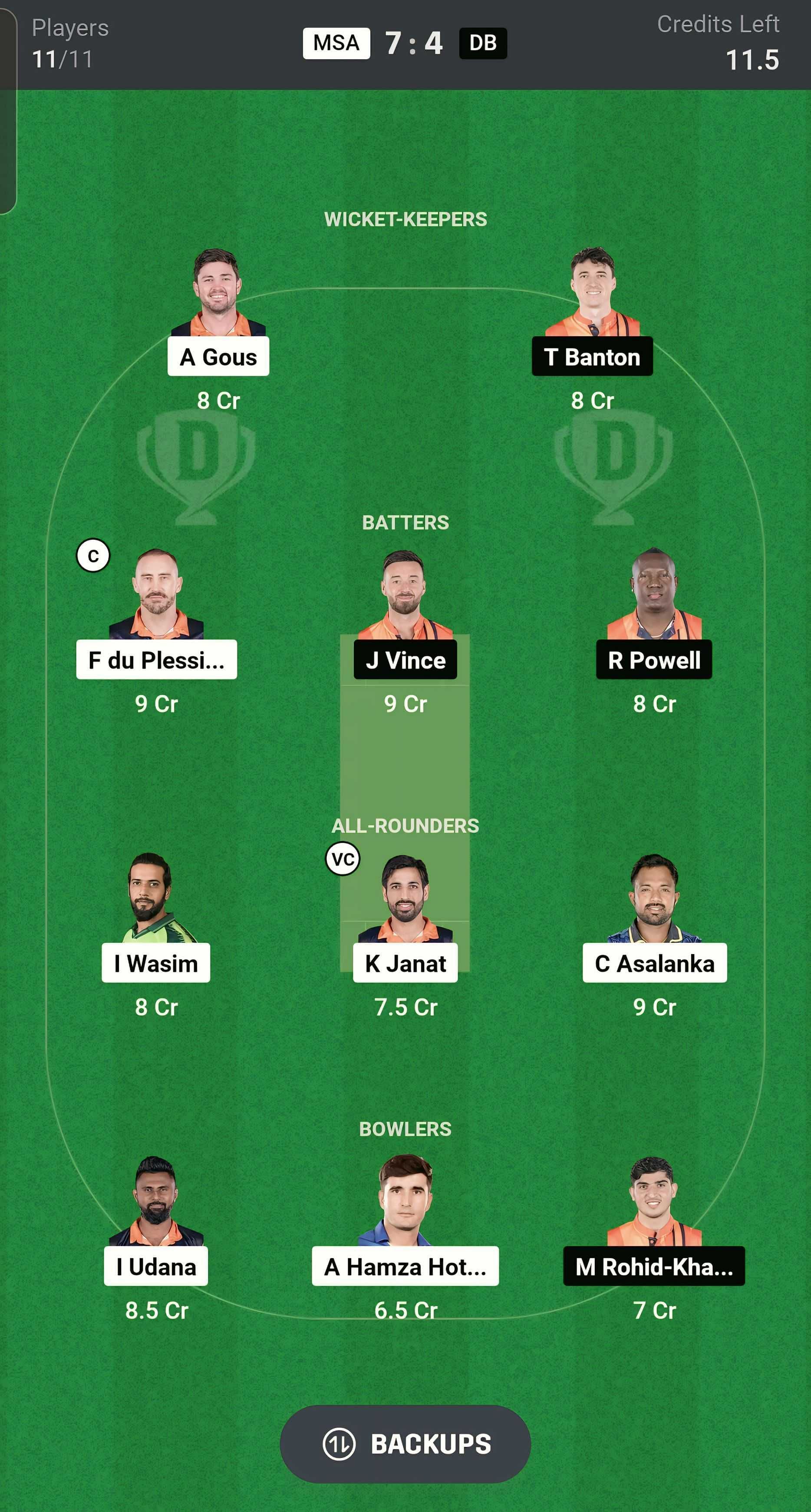 Faf du Plessis and Rovman Powell are the two best batters to pick for today's Dream11 team. Faf du Plessis has already smashed 180 runs in the last four matches. James Vince is another good batter for today's nail-biting match.