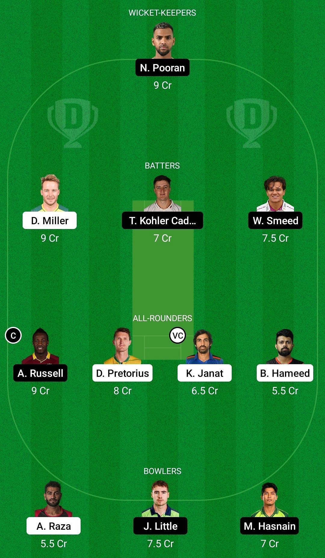 All-rounders: Andre Russell (c), Dwaine Pretorius, Karim Janat (vc), Basil Hameed