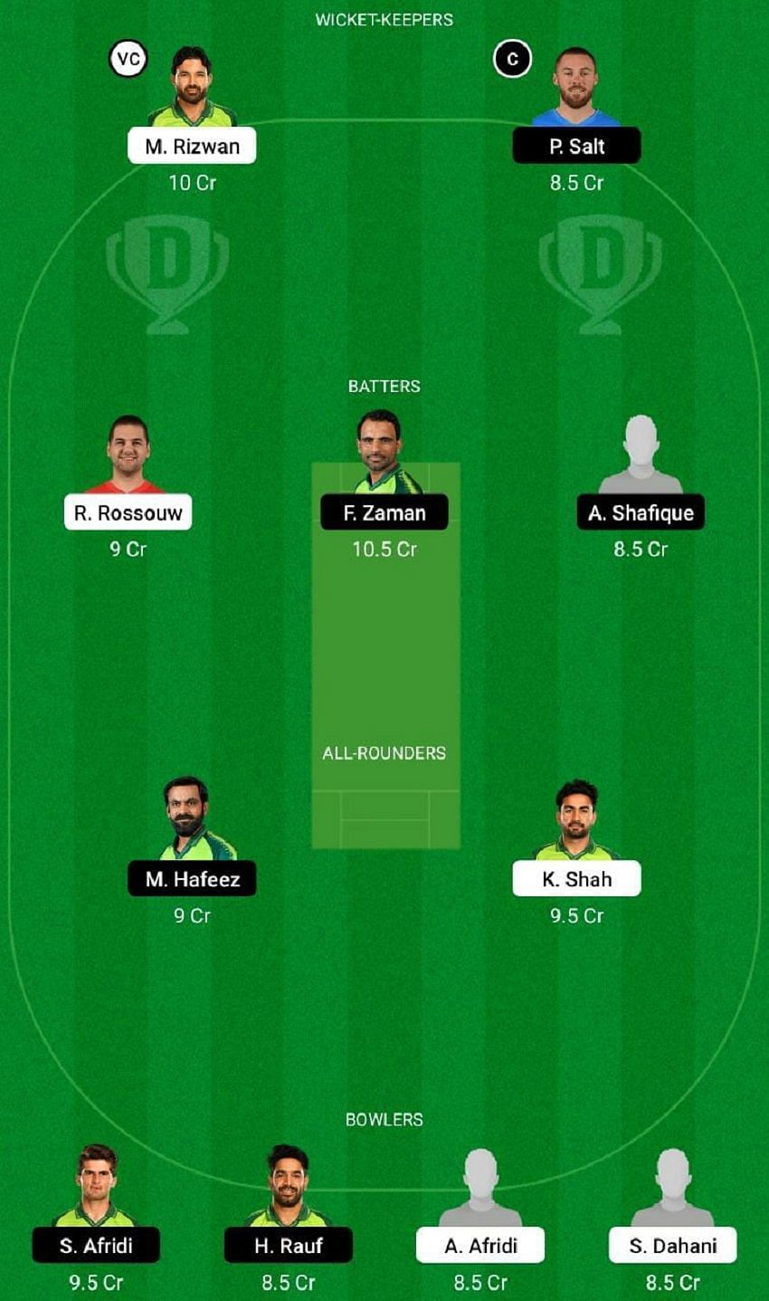 Fantasy Suggestion #1: Mohammad Rizwan, Phil Salt, Rilee Rossouw, Fakhar Zaman, Abdullah Shafique, Mohammad Hafeez, Khushdil Shah, Shaheen Afridi, Haris Rauf, Asif Afridi and Shahnawaz Dahani