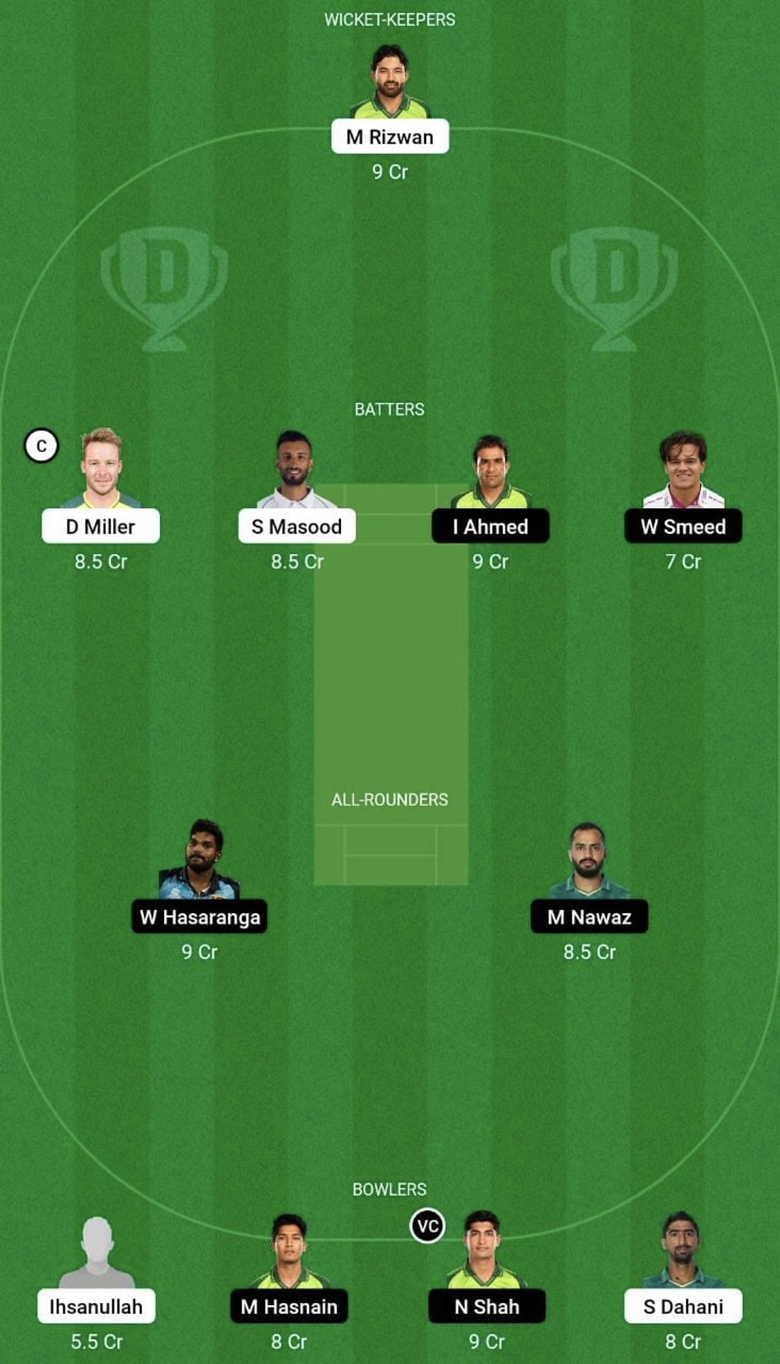 Jason Roy, Will Smeed, Abdul Bangalzai/Umar Akmal, Sarfaraz Ahmed (c&wk), Iftikhar Ahmed, Mohammad Nawaz, Wanindu Hasaranga, Odean Smith, Naseem Shah, Mohammad Hasnain and Umaid Asif/Aimal Khan.