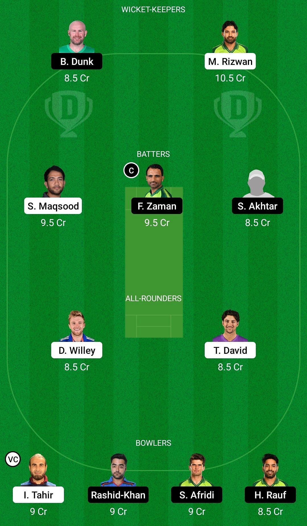 Fantasy Suggestion #2: Ben Dunk, Mohammad Rizwan, Shoaib Maqsood, Fakhar Zaman, Sohail Akhtar, David Willey, Tim David, Imran Tahir, Rashid Khan, Shaheen Afridi, Haris Rauf