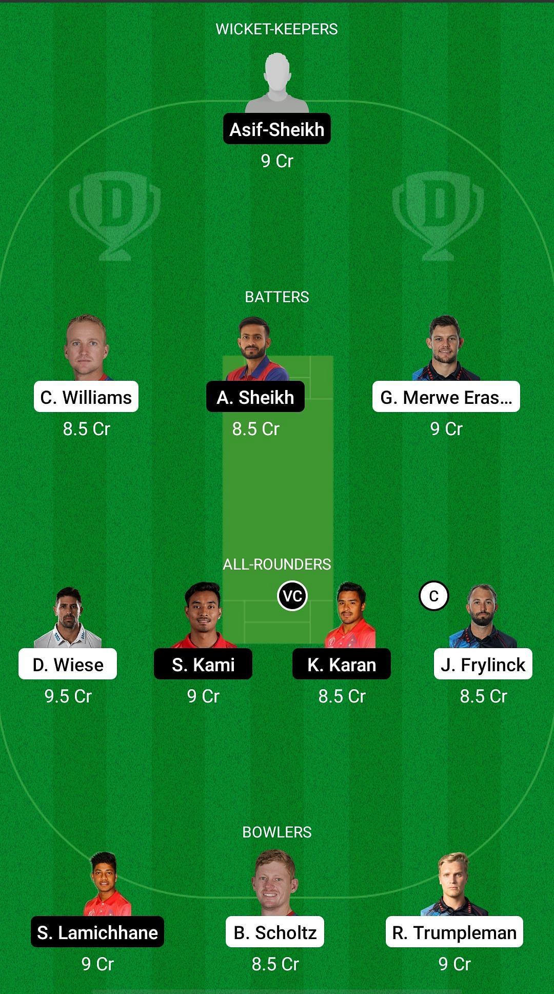 Fantasy Suggestion #1: Aasif Sheikh, Craig Williams, Aarif Sheikh, Gerhard Erasmus, David Wiese, Sompal Kami, Karan KC, Jan Frylinck, Sandeep Lamichhane, Ruben Trumpelmann, Bernard Scholtz.