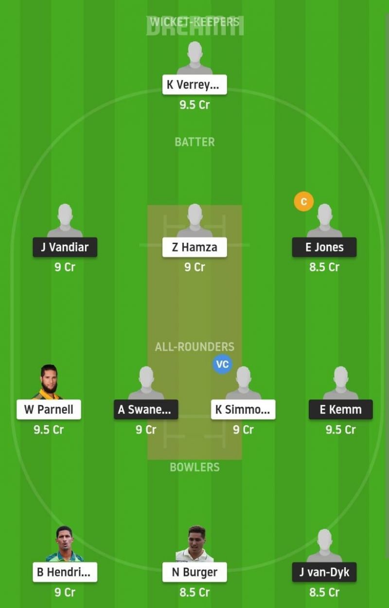 Ernest Kemm, Jonathan Vandiar, Rivaldo Moonsamy, Evan Jones, Aubrey Swanepoel (c), Qaasim Adams, Beyers Swanepoel, Issac Dikgale (wk), Johan van-Dyk, Andrew Rasemene, Jerome Xaba