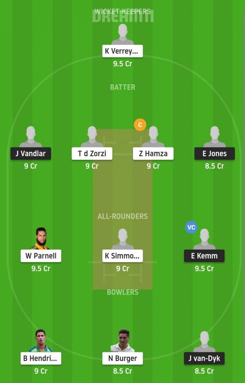 Zubayr Hamza, Tony de Zorzi, Kyle Verreynne (wk), Jonathan Bird, Aviwe Mgijima, Wayne Parnell (c), Kyle Simmonds, Jordan Woolf, Beuran Hendricks, Nandre Burger, Tshepo Moreki