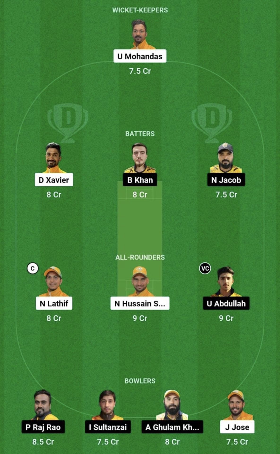 Diju Sheeli, Nimish Latif, Nasir Hussain (c), Meezan Ali, Unnimohan Mohandas (wk), Jithin Jose, Rubel Hossain, Manjula Prasan, Zafeer Ansari, Suresh Sibyala and Robin Samuel.