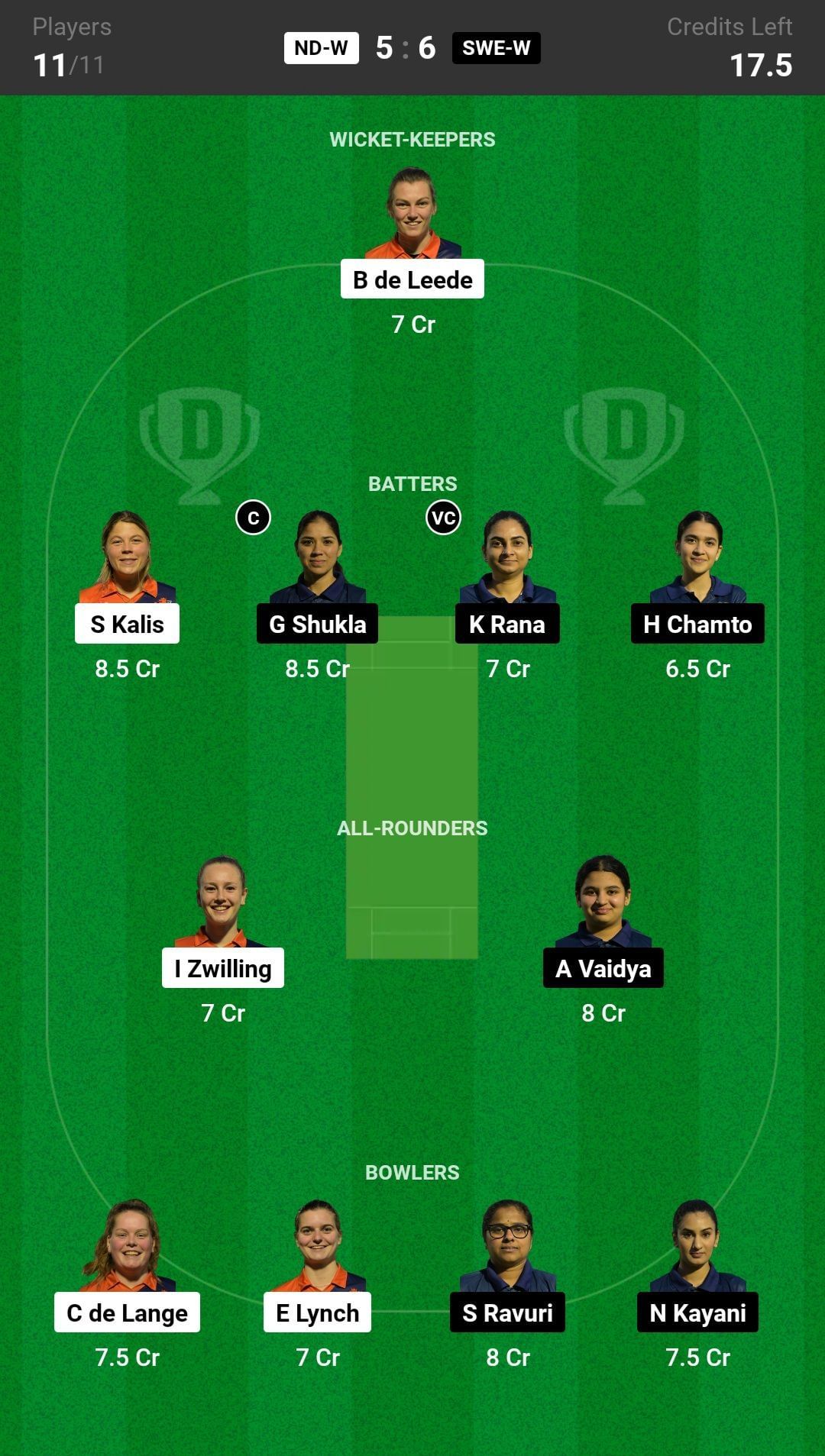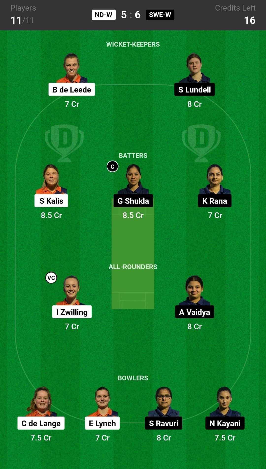 G Shukla is one of the best picks in Sweden Women's squad as she will bat in the middle order and also complete her quota of overs. Since the pitch is decent, she can be a good captaincy pick for the grand leagues. She has smashed 25 runs and taken 4 wickets in the last four matches.