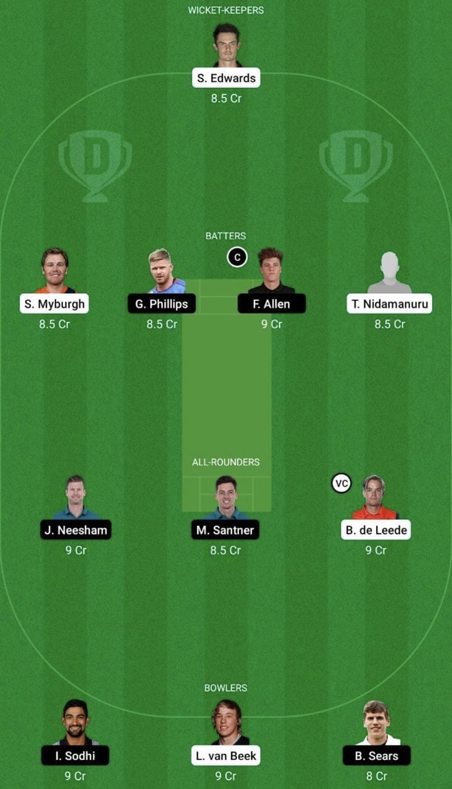 Fantasy Suggestion #2: Scott Edwards, Glenn Phillips, Stephan Myburgh, Finn Allen, Teja Nidamanuru, James Neesham, Mitchell Santner, Bas de Leede, Ish Sodhi, Logan van Beek and Ben Sears.