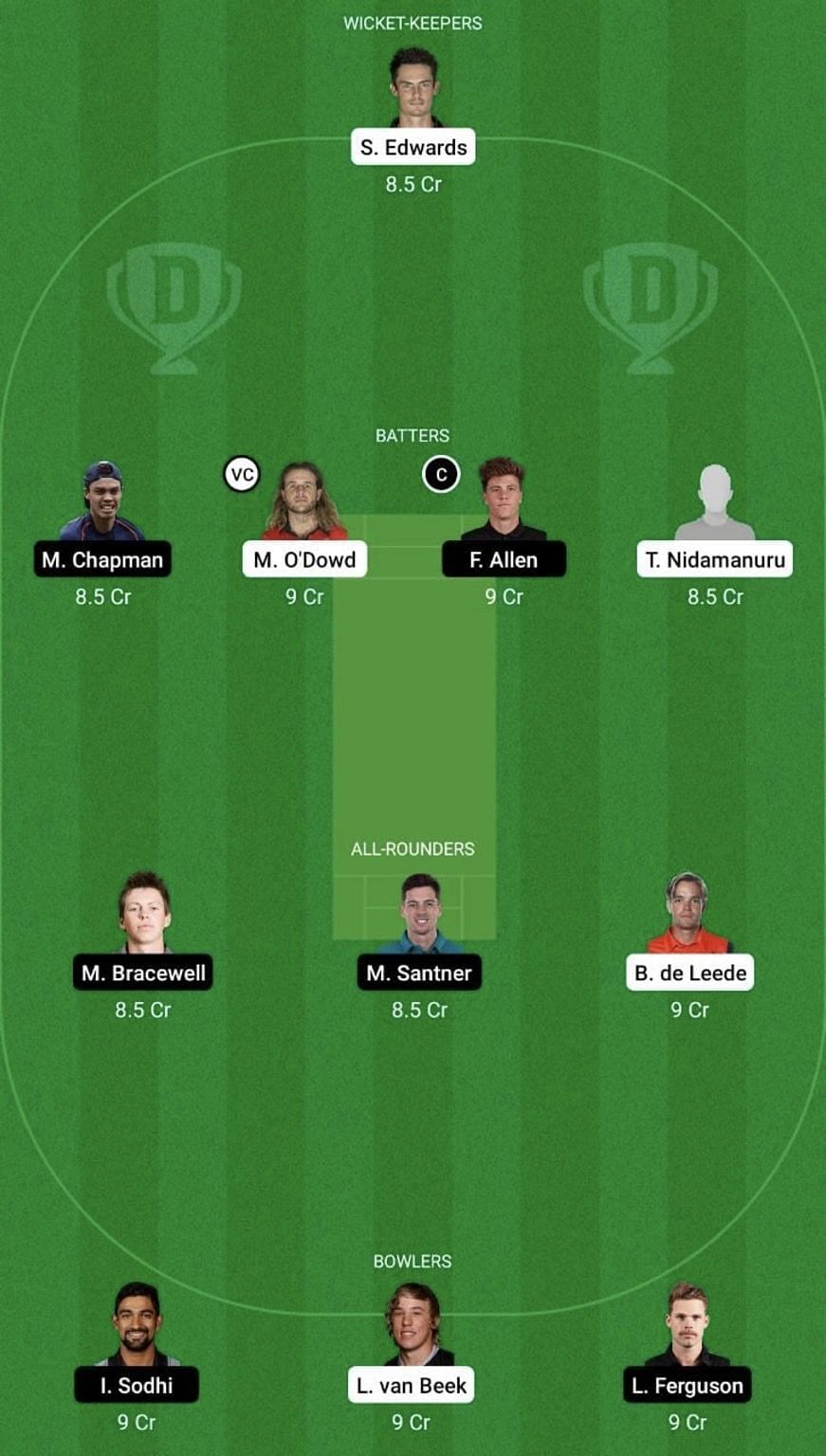 Fantasy Suggestion #1: Scott Edwards, Mark Chapman, Max O'Dowd, Finn Allen, Teja Nidamanuru, Michael Bracewell, Mitchell Santner, Bas de Leede, Ish Sodhi, Logan van Beek and Lockie Ferguson.