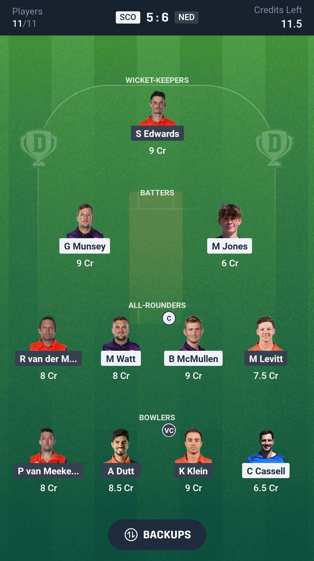 Netherlands vs Scotland Dream11 Prediction Today, Grand League