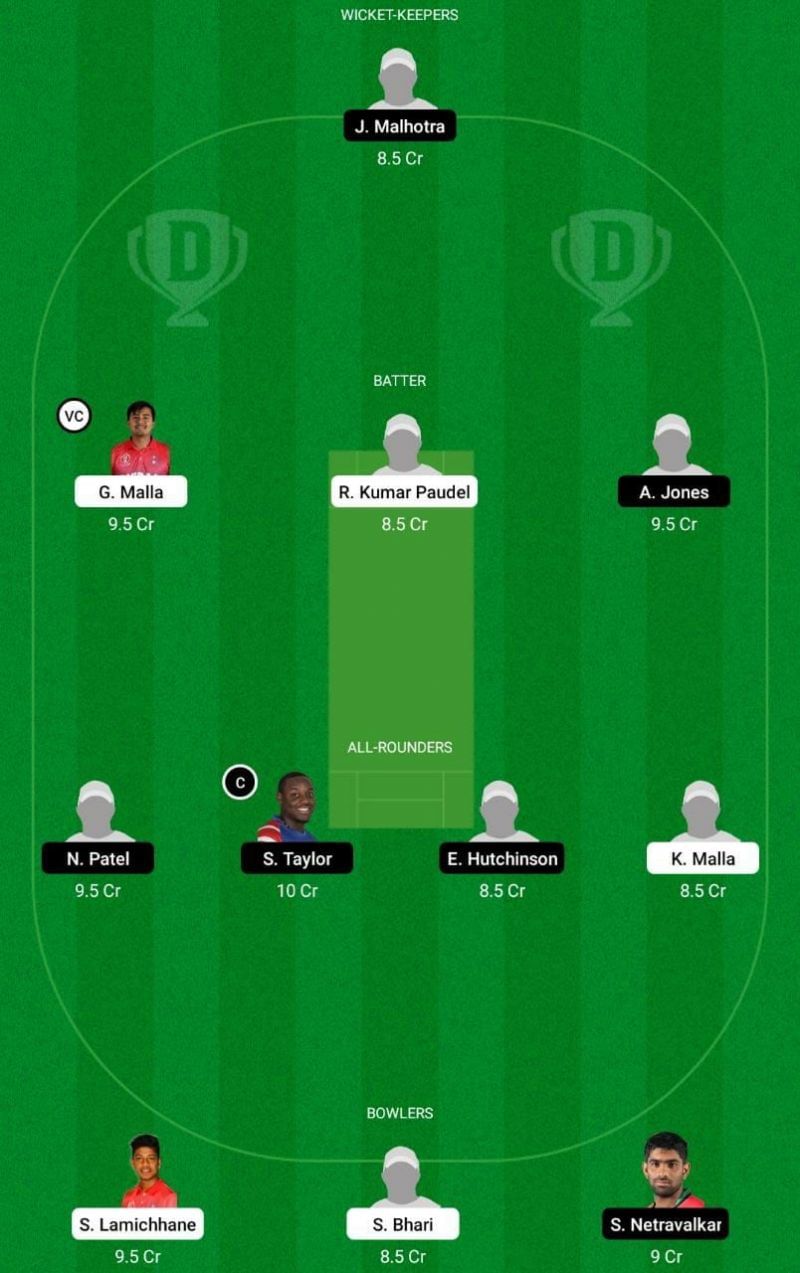 Fantasy Suggestion #1: Jaskaran Malhotra, Aaron Jones, Gyanendra Malla, Rohit Kumar Paudel, Steven Taylor, Nisarg Patel, Kushal Malla, Karima Gore, Saurabh Netravalkar, Sandeep Lamichhane and KC Karan