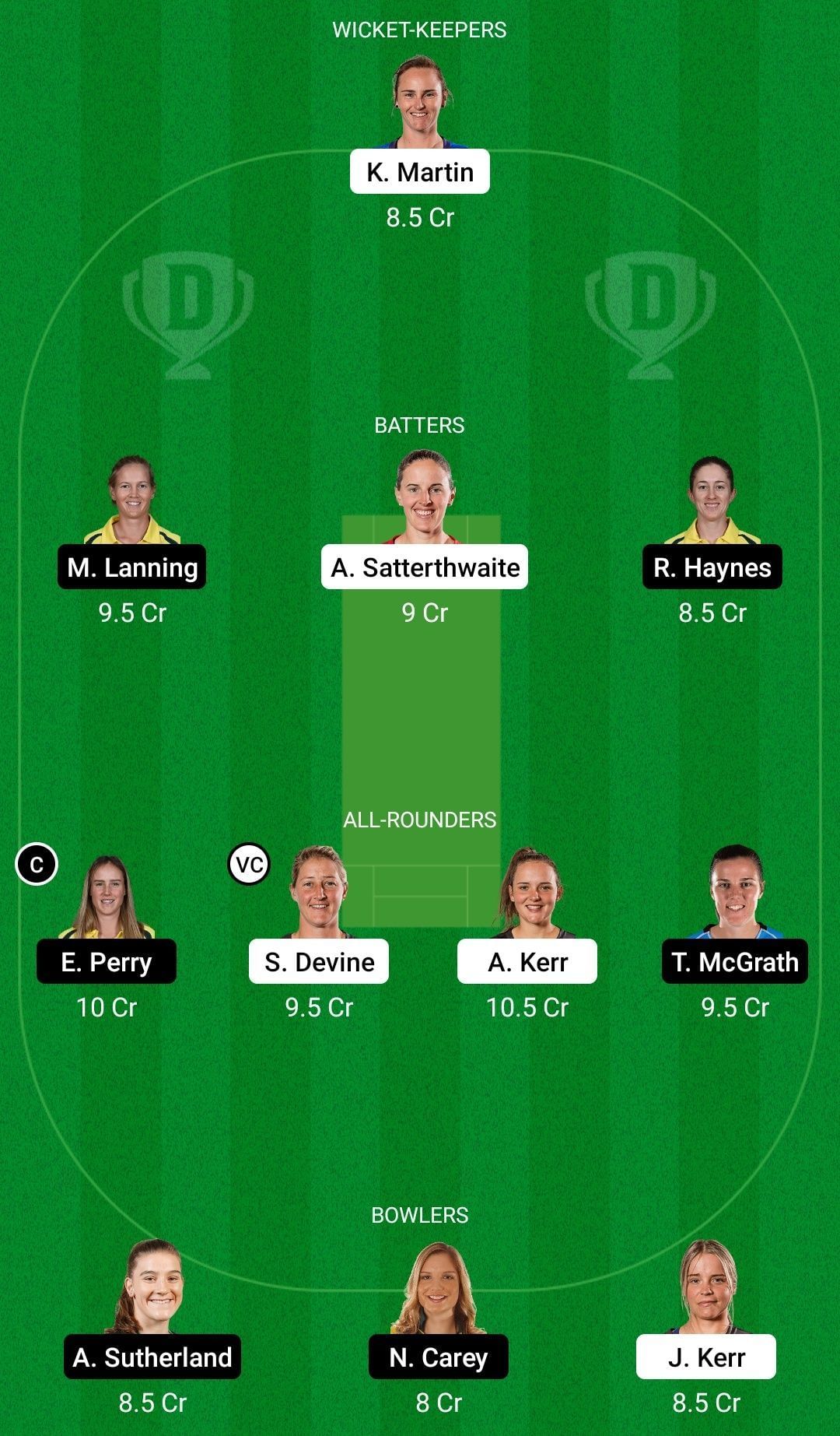Fantasy Suggestion #1: Katey Martin, Beth Mooney, Amy Satterthwaite, Rachael Haynes, Ellyse Perry, Sophie Devine, Amelia Kerr, Tahlia McGrath, Annabel Sutherland, Alana King, Jess Kerr