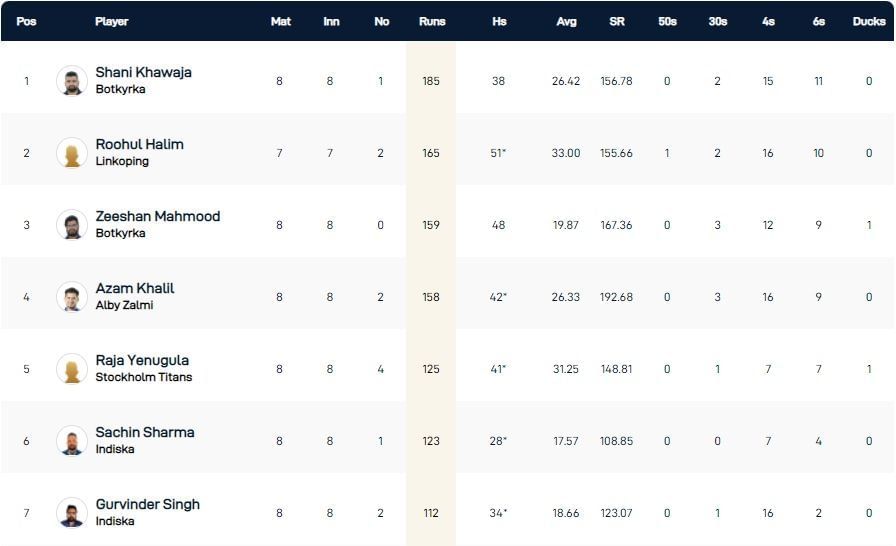 Linkoping's Roohul Halim is second in the run-scoring charts. He has aggregated 165 runs thus far, with an unbeaten 51 being his highest score. Halim has scored his runs at a strike rate of 155.66, with the help of 16 fours and ten maximums.