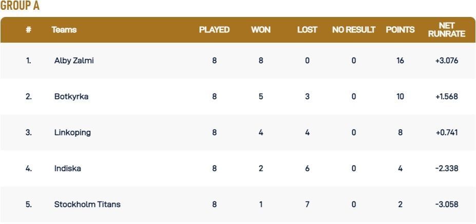 Stockholm Tigers are perched atop the Group B points table. They won both their games on Saturday and have four points to their credit. Meanwhile, Hammarby and Marsta have both won and lost a game apiece. Both teams have two points, with the former having a better net run rate.