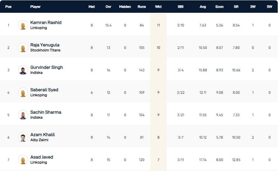 Stockholm Titans' Raja Yenugula, who has accounted for ten dismissals, occupies second spot in the wicket-taking charts. He has 2-11 as his best spell and a decent economy rate of 8.07.