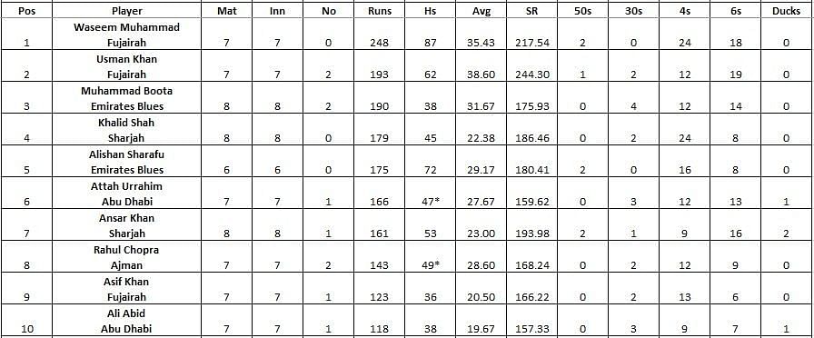 Sharjah's Khalid Shah (179), Abu Dhabi's Attah Urrahim (166), Ajman's Rahul Chopra (143) and Dubai's Ameer Hamza (112) have scored the most runs for their respective teams.