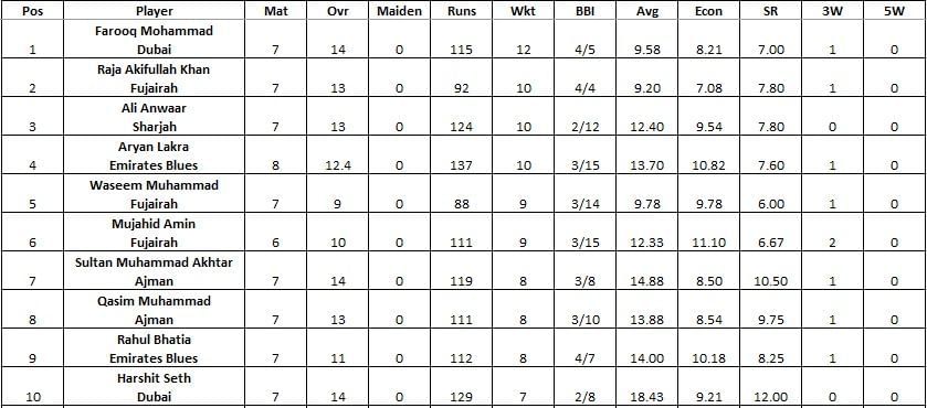 The Emirates Blues' Aryan Lakra (10), Ajman's Sultan Muhammad Akhtar (8) and Qasim Muhammad (8), and Abu Dhabi's Muhammad Zubair Khan (6) and Faisal Shah (6) have been the most successful bowlers for their respective teams thus far.