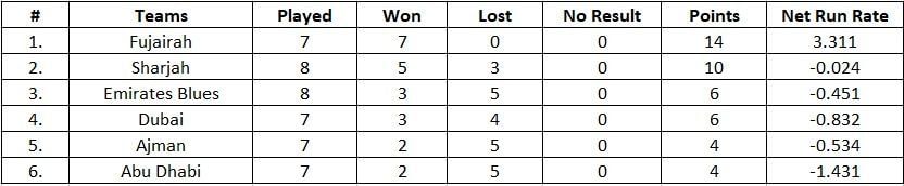 The Emirates Blues and Dubai are placed third and fourth in the standings, respectively. Both teams have six points, with the former having a slightly better net run rate.