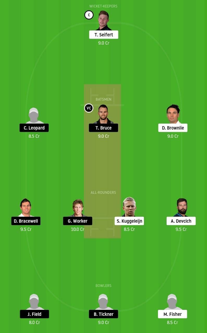 Tim Seifert (WK), Katene Clarke, Dean Brownlie, Anton Devcich (C), Henry Cooper, Brett Hampton, Scott Kuggeleijn, Fred Walker, Zak Gibson, Joe Walker and Matt Fisher