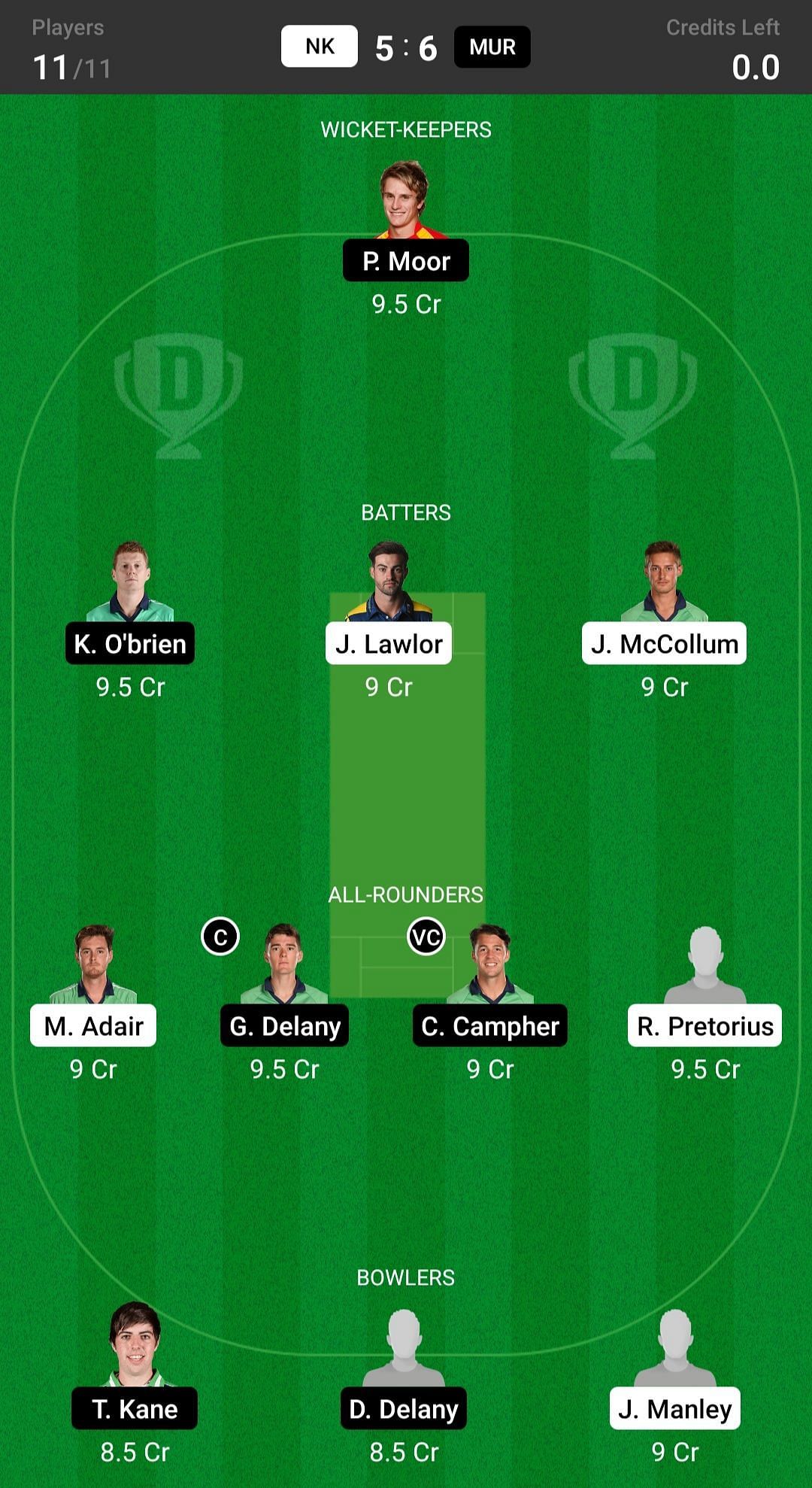 Fantasy suggestion #1: P Moor, K O'Brien, J Lawlor, J McCollum, G Delany, R Pretorius, C Campher, M Adair, T Kane, J Manley, and D Delany
