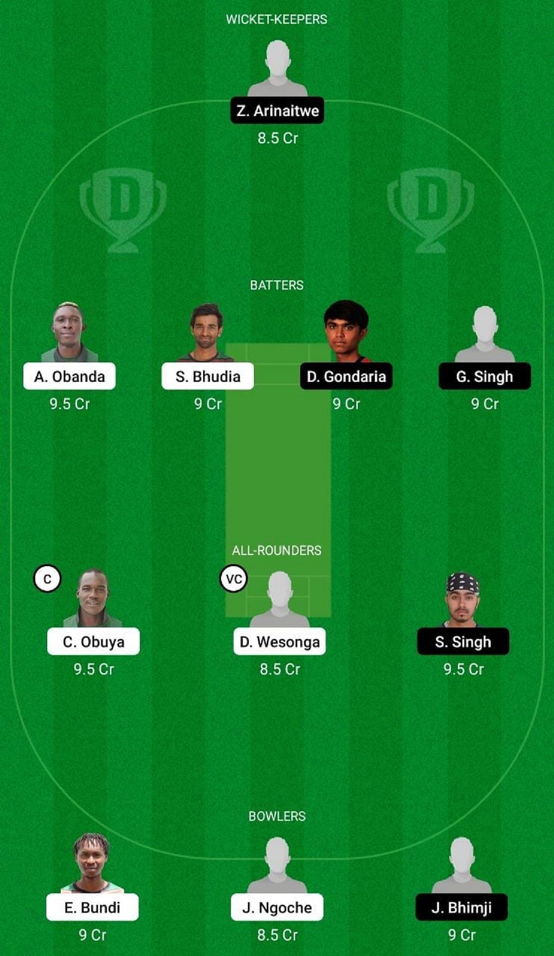 Fantasy Suggestion #1: Z Arinaitwe, A Obanda, D Gondaria, G Singh, S Bhudia, C Obuya, D Wesonga, S Singh, E Bundi, J Bhimji, J Ngoche.