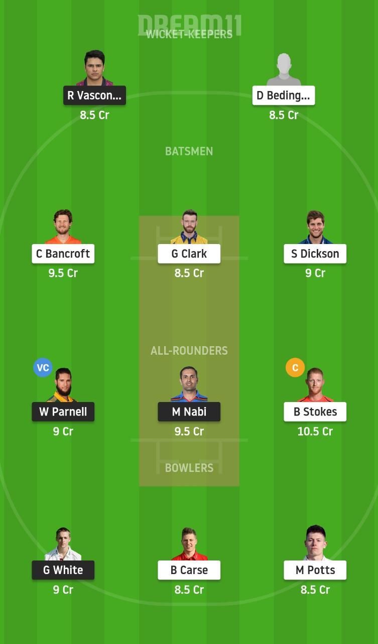 Fantasy Suggestion #1: Ricardo Vasconcelos, David Bedingham, Cameron Bancroft, Graham Clark, Sean Dickson, Wayne Parnell, Ben Stokes, Mohammad Nabi, Graeme White, Matty Potts, Brydon Carse