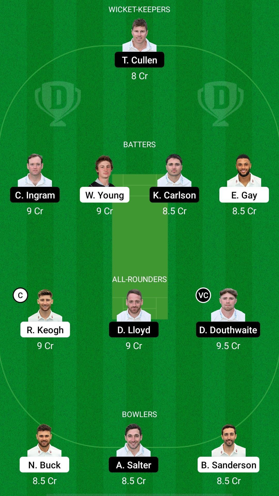 Kiran Carlson (C), David Lloyd, Sam Northeast, Colin Ingram, Billy Root, Joe Cook, Tom Cullen (WK), Dan Douthwaite, Andrew Salter, James Weighell, Jamie Mcllroy.