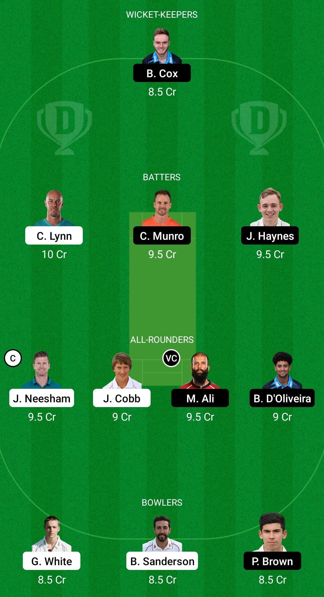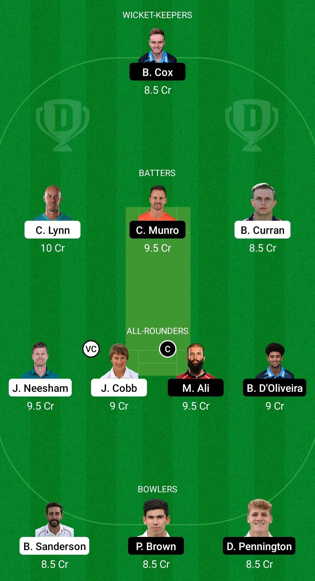 Fantasy Suggestion #1: Ben Cox, Chris Lynn, Colin Munro, Ben Curran, Jimmy Neesham, Josh Cobb, Moeen Ali, Brett D'Oliveira, Ben Sanderson, Pat Brown, Dillon Pennington.