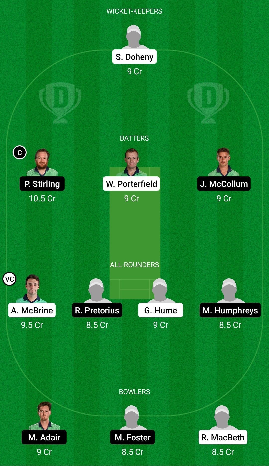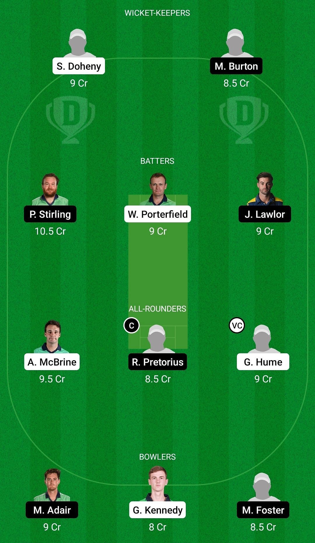 Fantasy Suggestion #1: Stephen Doheny, Paul Stirling, William Porterfield, James McCollum, Andy McBrine, Ruhan Pretorius, Graham Hume, Matthew Humphreys, Mark Adair, Matthew Foster, Ryan MacBeth.