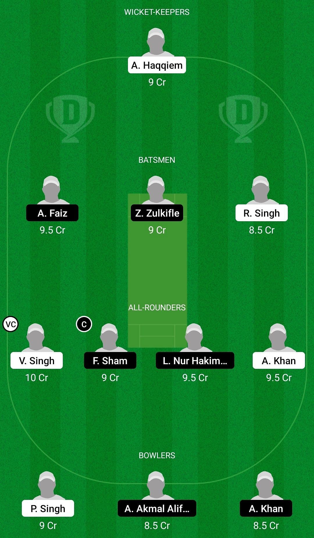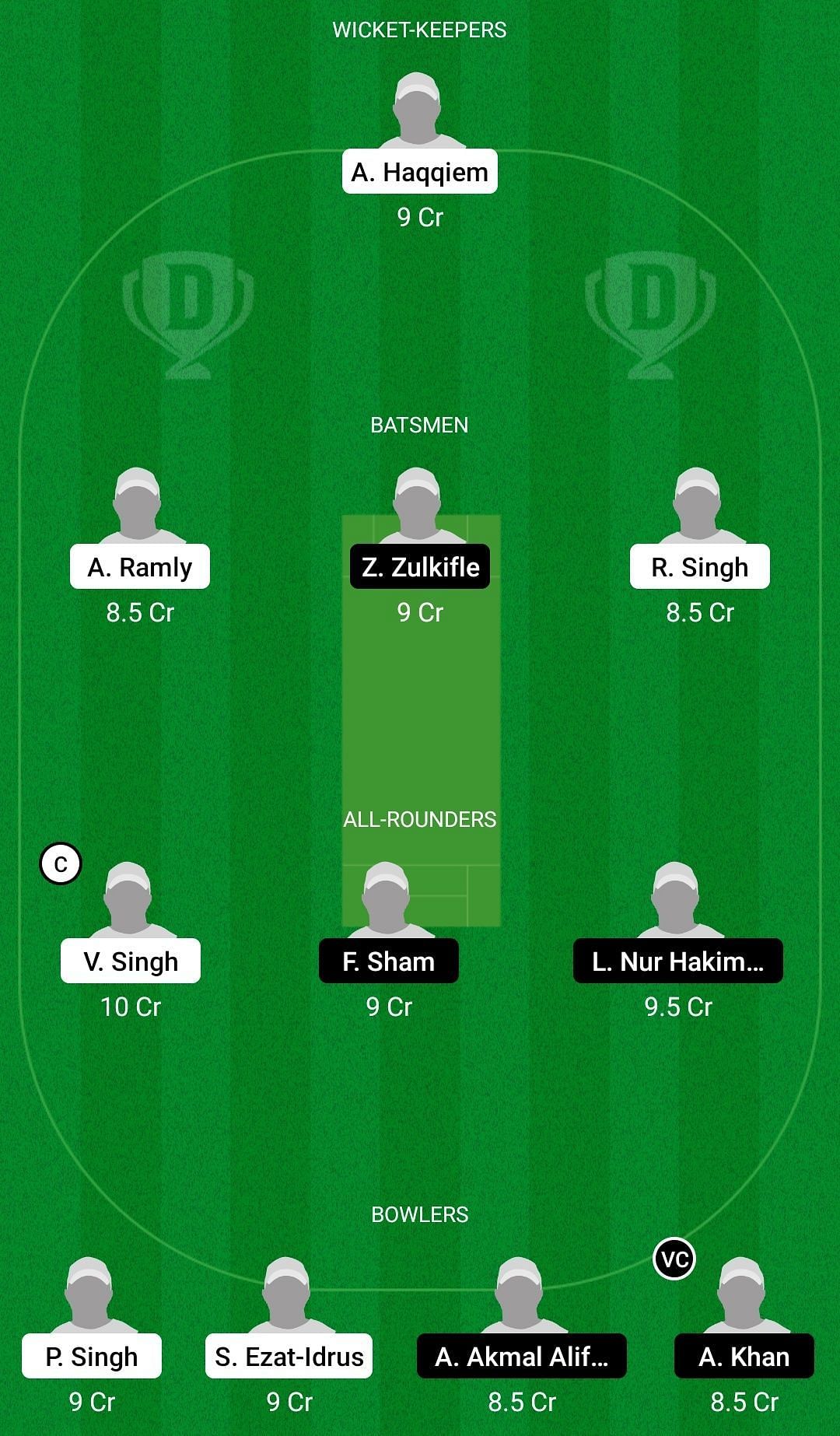 Fantasy Suggestion #1: Ainool Haqqiem, Ahmad Faiz, Ahmad Zubaidi Zulkifle, Roshan Singh, Virandeep Singh, Fitri Sham, Lokman Nur Hakim, Aimal Khan, Pavandeep Singh, Ahmad Akmal, Ajeb Khan