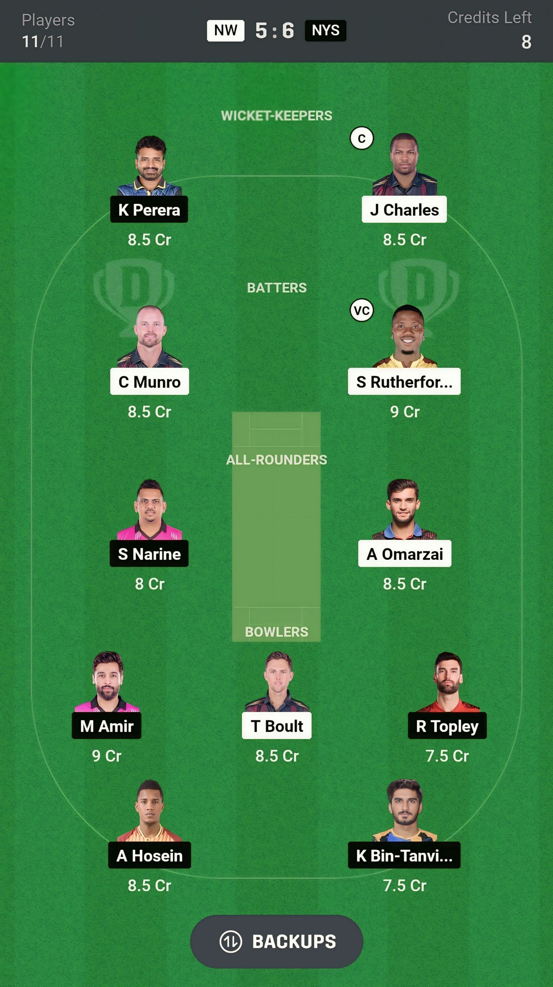 Bowlers: T Boult, M Amir, A Hosein, K Bin Tanvir, R Topley